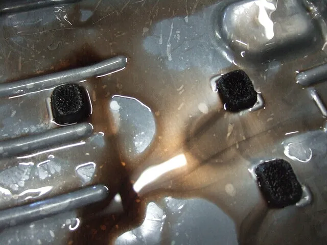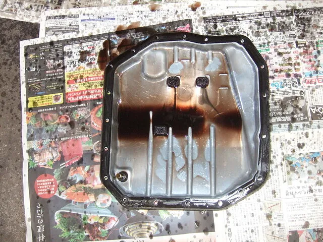 オイルパン底部には 汚れたオイルが滞留。 マグネットには大量の鉄粉が付着。