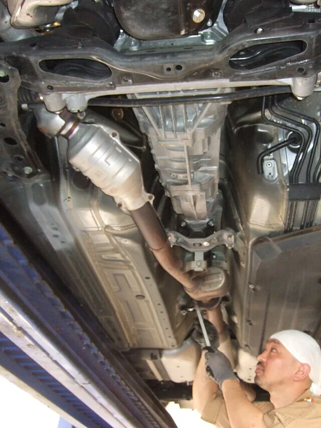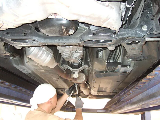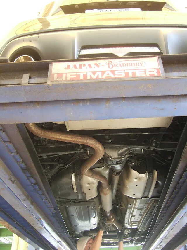 リフトで持ち上げられた車両の下、作業着姿のスタッフが手際よく点検を進めています。