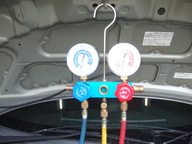 写真は際の作業風景で、専用ゲージマニホールドを使ってエアコンシステムの状態をしっかりチェックしています。